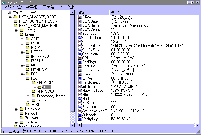 2.左側のウィンドウで「HKEY_LOCAL_MACHINE」のキー自体を左クリックして下さい。 次に「HKEY_LOCAL_MACHINE の左の+マーク」を左クリックして下さい。 同様に、以下は順番に「Enum の左の+マーク」、「Root の左の+マーク」、 その次は「*PNP0C01 の左の+マーク」と、+マークを左クリックしていきます。 この「0000キー」を左クリックして下さい(0001とか0002の場合もあり得ます)。 さあ、右側のウィンドウにデータが現れました。 「DeviceDesc」という項目の値が「システム ボード」となっています。